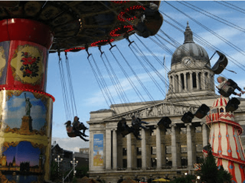 It was a very nice city. Officially called The City of Nottingham, it became a city in 1897 as part of the Diamond Jubilee celebrations for Queen Victoria. They had a main square called the “Old Market Square” with a lot of activities. There was a Ferris Wheel and a rotating swing seat or whatever its called! and right behind the rides was the majestic Nottingham Council House Whiskey and Milk walked all the way with their hats they had bought in Sherwood Forest