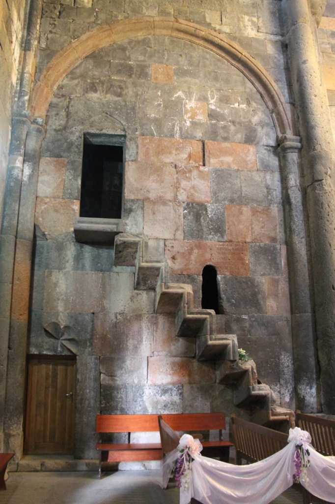 The centerpiece of the monastery is the Cathedral built between 1216 and 1221 through the donation of Prince Vache I Vachutian Amberdtsi (Վաչե Ա). The Cathedral has a cruciform floor plan, with two storey sacristies in each of the four extensions of the church. The dome has an umbrella-shaped roof, which is unique to Armenian churches. The Cathedral’s important decorations include carved scenes from the Parable of the Wise and Foolish Virgins (Matthew 25:1-13).