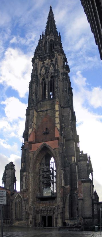 The Church of St. Nicholas (German: St.-Nikolai-Kirche) was a Gothic Revival cathedral that was formerly one of the five Lutheran Hauptkirchen (main churches) in the city of Hamburg, Germany. The original chapel, a wood building, was completed in 1195. It was replaced by a brick church in the 14th century, which was eventually destroyed by fire in 1842. The church was completely rebuilt by 1874, and was the tallest building in the world from 1874 to 1876.