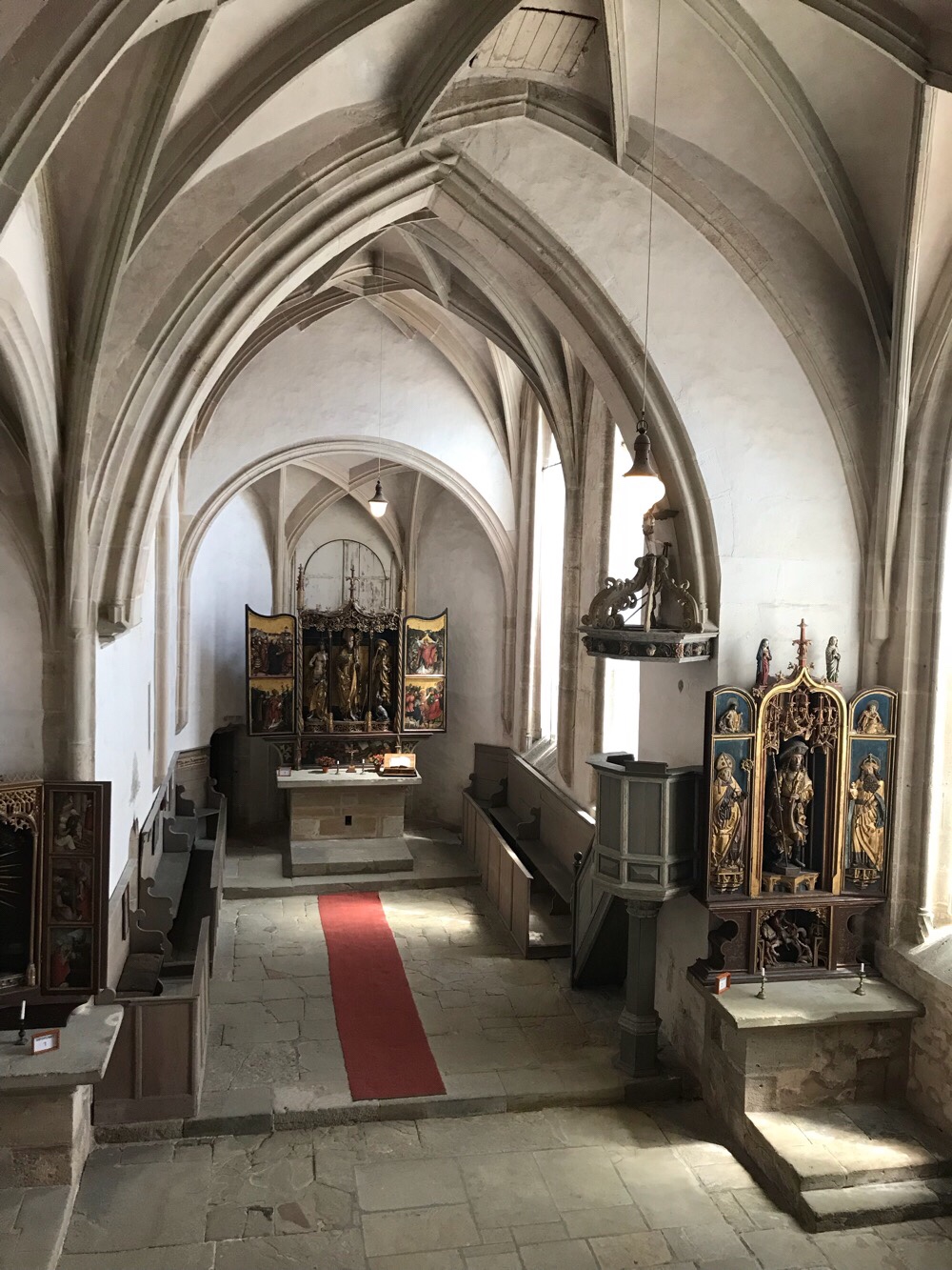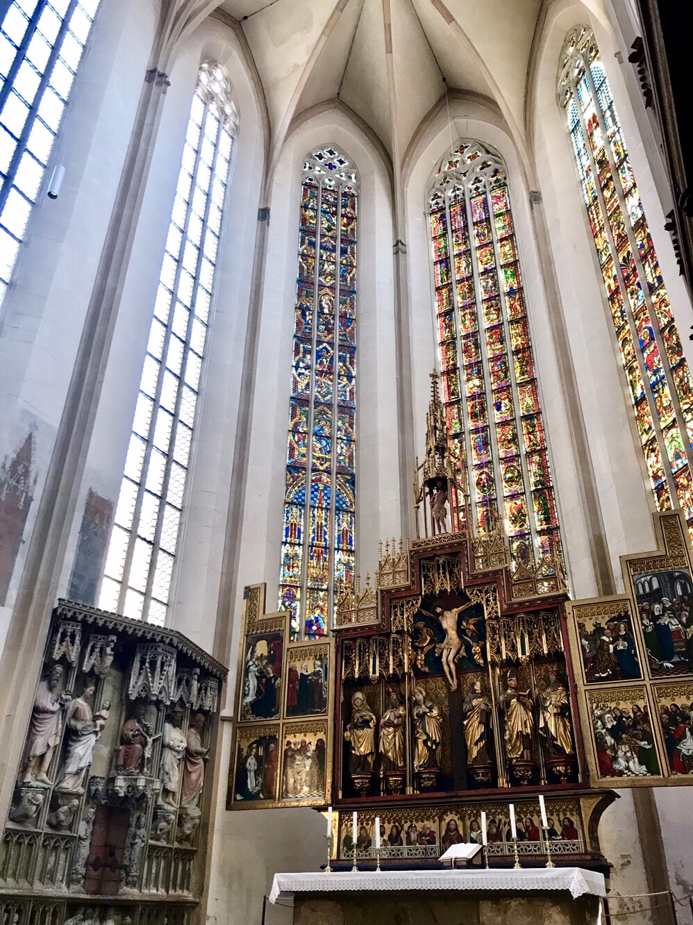 The High Altar was built in 1466 is one of the most beautiful altars in Germany carved in wood and the colourful paintings which are by a Nordic artist Friedrich Herlin