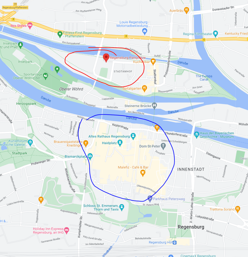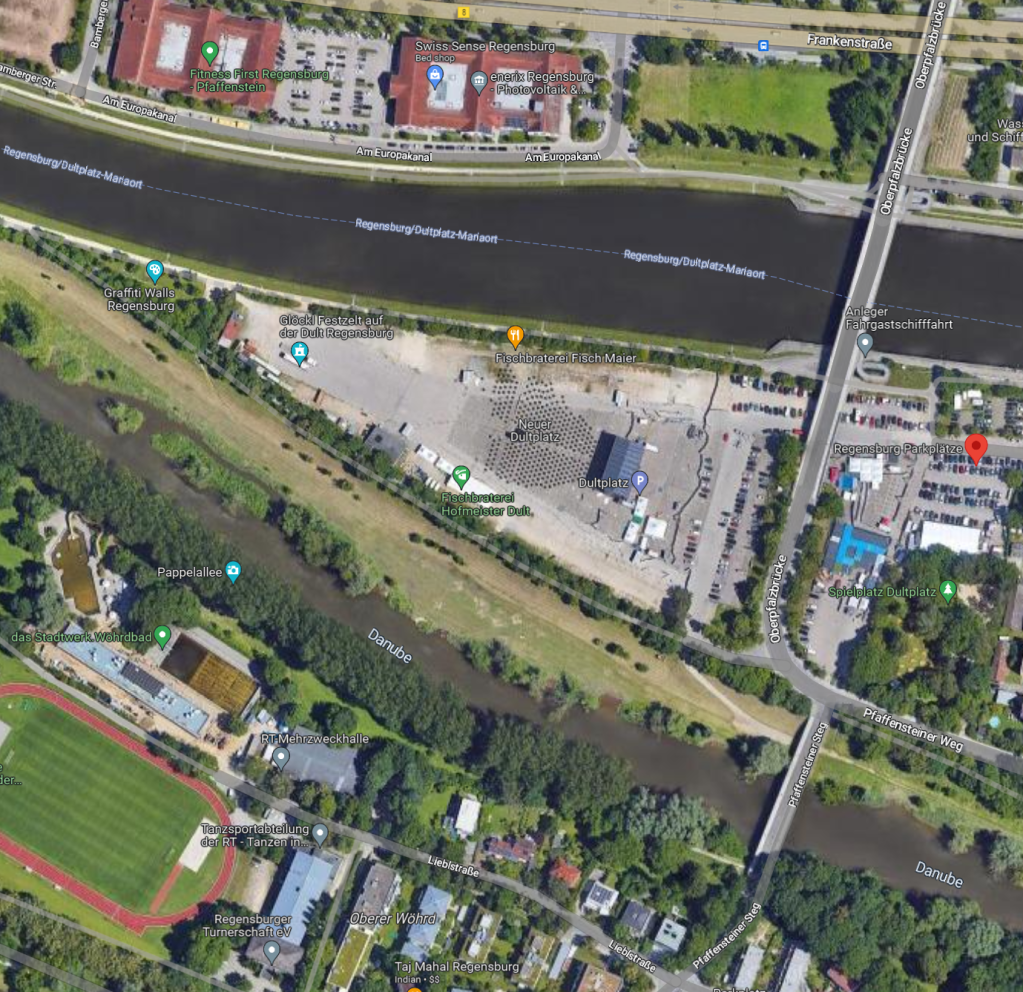 Large mix-parking – located on the island of the Danube – during events closed – from here the center of Regensburg is easy to reach