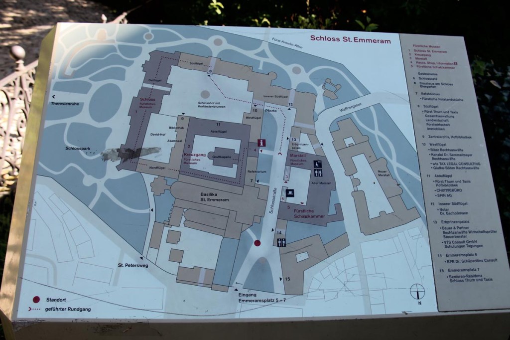 St. Emmeram’s Abbey, now known as Schloss Thurn und Taxis, was a Benedictine monastery founded in about 739 at the grave of the itinerant Frankish bishop Saint Emmeram. Its a huge castle owned by the powerful Thurn and Taxis family.