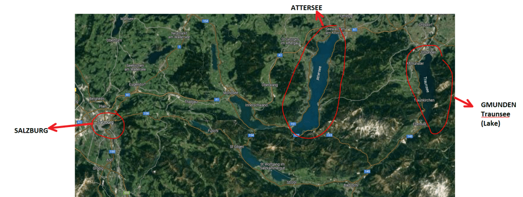Gmunden is in upper Austria and only has around 13,200 population, so its a cute little town with not too many people, surrounded by beautiful high mountains (including Traunstein which is 5446 feet – Erlakogel 5150 ft – Wilder Kogel 6860 ft)