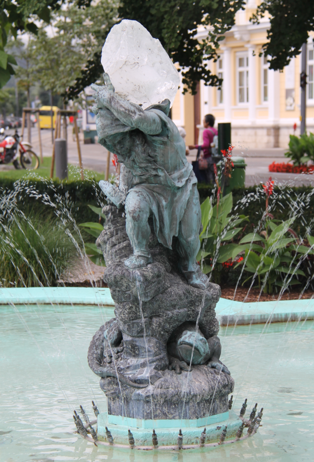 An interesting fountain, “a man holding a “The Gnome” by artist Heinrich Natter – its carrying a 60kg berg crystal