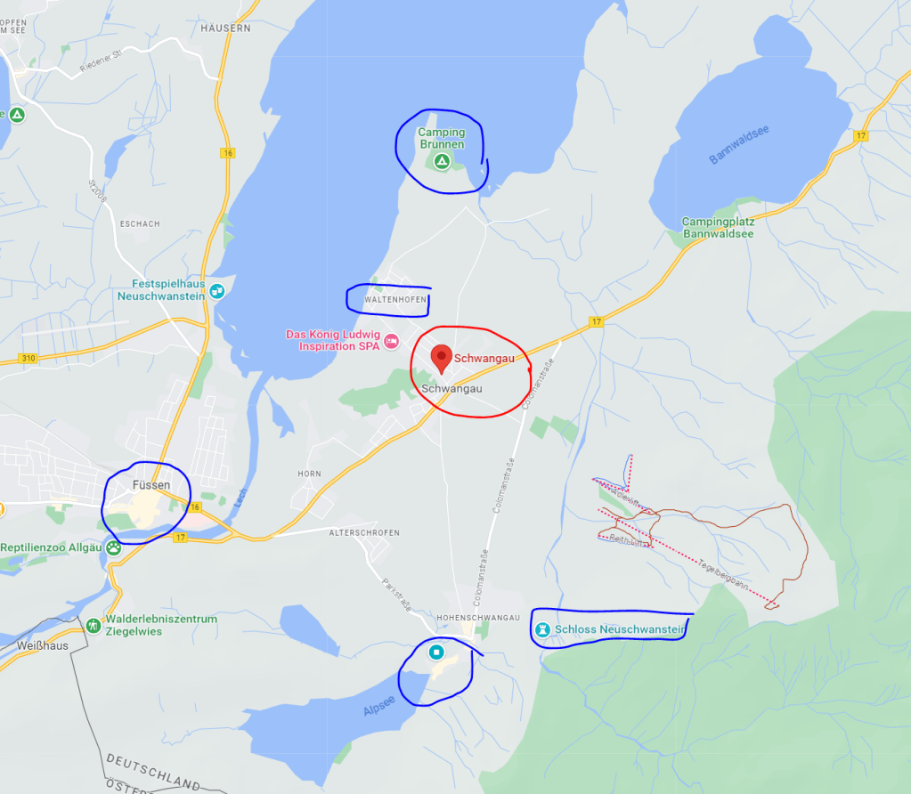 Found a really picturesque location to stay right on the larger lake called Forggensee at Camping Brunnen, a pretty touristy area we soon found out! Glad to have stayed further out