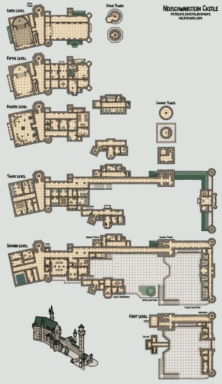 King Ludwig wanted the castle to have several different sections : a gateway building, Knights building, ladies apartments, royal palace a keep and chapel