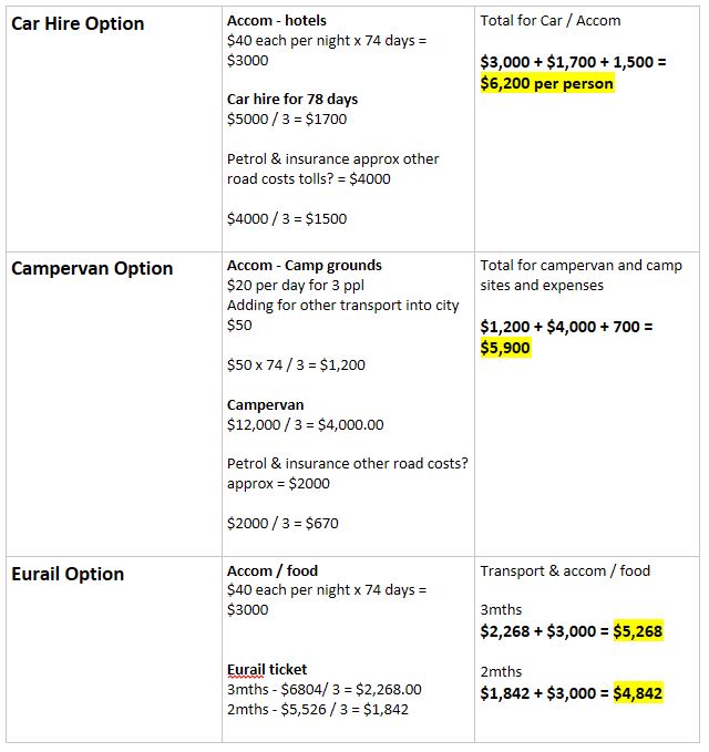 Group tours were most definitely OUT of the question, SO, this is the cost comparison I came up with going off my previous experiences and some research, I did a cost per person plan to see if it would be better to go via Eurail (trains) hire a car or campervan: