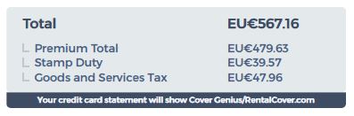 – Zero excess rental cover – This insurance policy includes EU€2,600.00 coverage for all types of single & multi-vehicle accidents plus things the