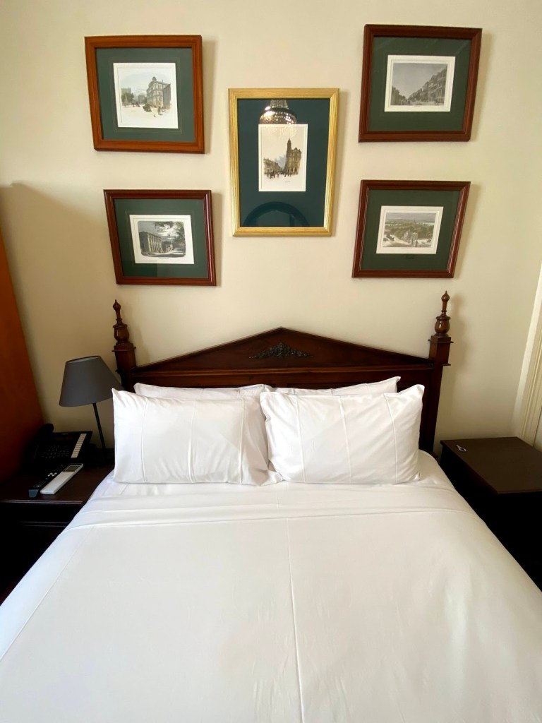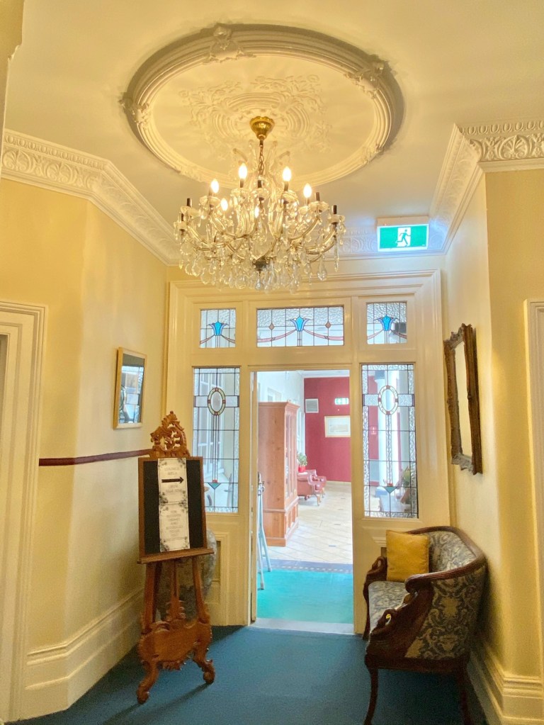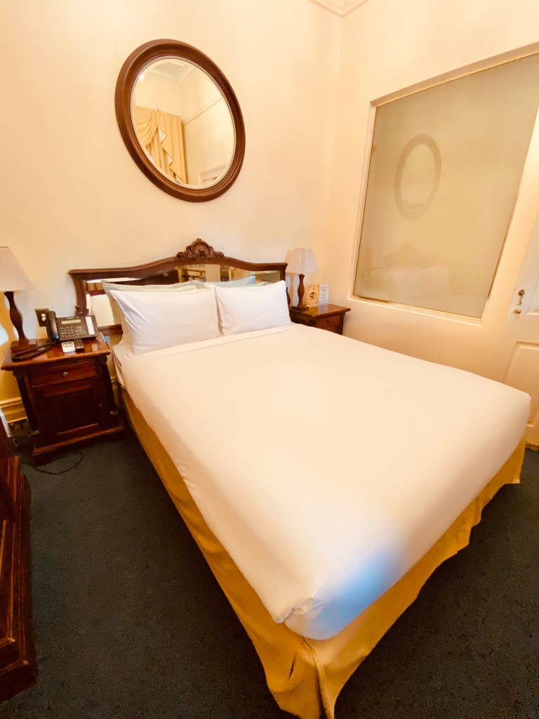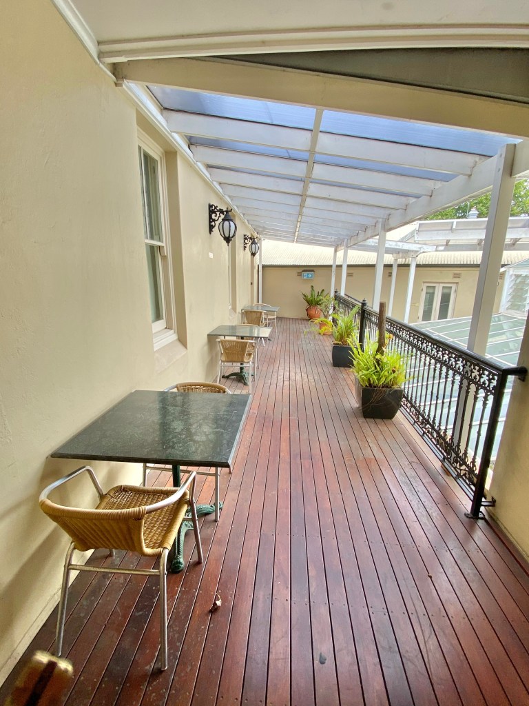 The facade was beautiful, deceptively small from the outside and then so many rooms on 2 floors when you walk in! The entrance to the beautiful heritage hotelThe little garden at the front was so pretty with the gold fish swimming aroundI stayed here because of the location to Fox Studios – was a 15-20 min walk through Moore ParkI had room number 10 at the top front of the house right in front of the communal balcony – the window was facing the street but they had installed an additional window which blocked off all noise, was fantastic! The room was very dark with the block out curtains My room was nice and cute, a smallish room but as the ceilings are so high it didnt feel small or claustrophobic at allThe bathroom was very interesting! It was designed in a long shape against the side wall of the room and the bathtub at the end with a step up on the other end, first design i’d seen like this (ps. The hair dryer on the wall doesnt work, instead they have supplied a much better high quality hair dryer)The room from the other side, the glass on the wall is where there bath isThe breakfast area – such a nce place to hang out The top floor heading towards front of the hotel and out to the shared balcony facing Flinder StThe ground floor heading out towards the atrium and breakfast room and sitting area with the piano roomThe atrium from the 2nd floor looking down, there are seperate rooms at the back of the property with a few addtional roomsThe balcony at the back overlooking the atrium, its really nice that they have a lot of places to sit around inHeading up to the 2nd floor rooms and sitting areaThe piano room sitting area in the common areaThe bedroomBathroom