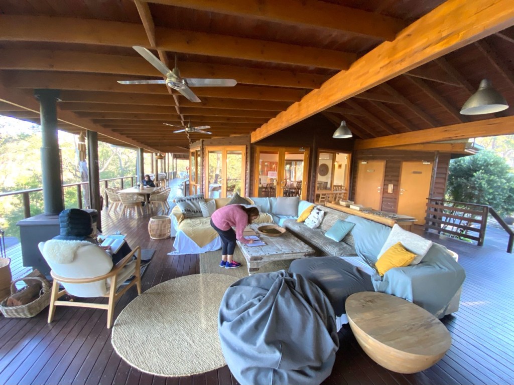 The lovely fire place, this was on all the time when we were there Another inside sitting area The pool area for those who want to swimThe sitting area around the fire – we read our books here under a blanket with the fire going, was so relaxing…The main lodge looking up from our treehouses