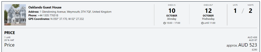 Located in the quiet back streets of Weymouth, its a little walk away from the main town centre but its safe and I didnt mind walking – parking is included which is what was attractive to me and being more in the suburban area it was easy to park