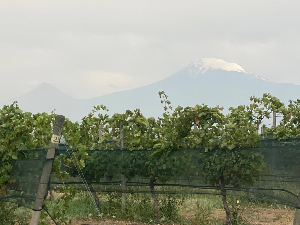 Behind the vines you can see beautiful Ararat mountains