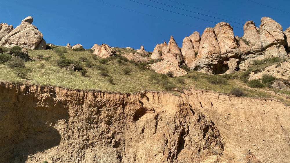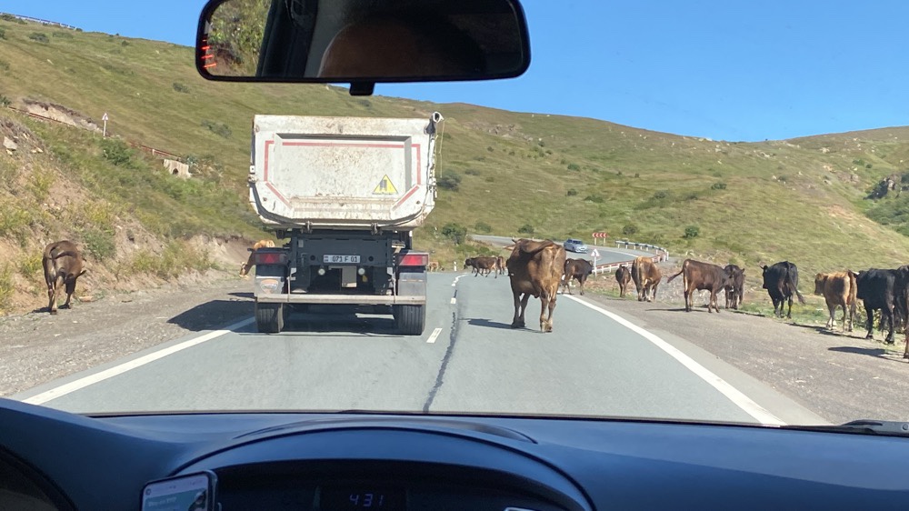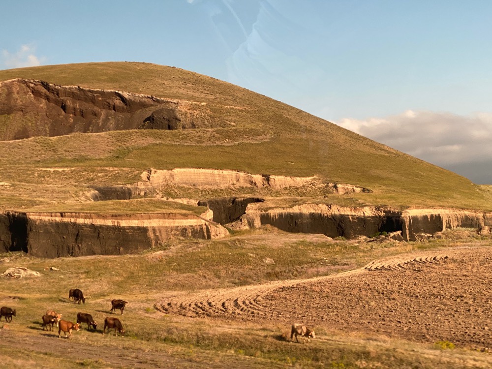 The unique rock forms on the way towards the south, reminds me of Cappadocia in turkey with the turretsReally close to Sisian if you want a nice picnic spot this would be perfect 18m high waterfall – basalt lava flows have solidified and formed this beautiful waterfall Driving through Siyunik regionGreen bushes popped up every now and again where there was red sands and deep orange colours I guess the farmers are working from home this day? Cows all over the roads!The new paved roads… such a massive difference from what they were before! Pot holes everywhere and it took double or triple the amount of time to get anywhereDeep red and arid farmland again…