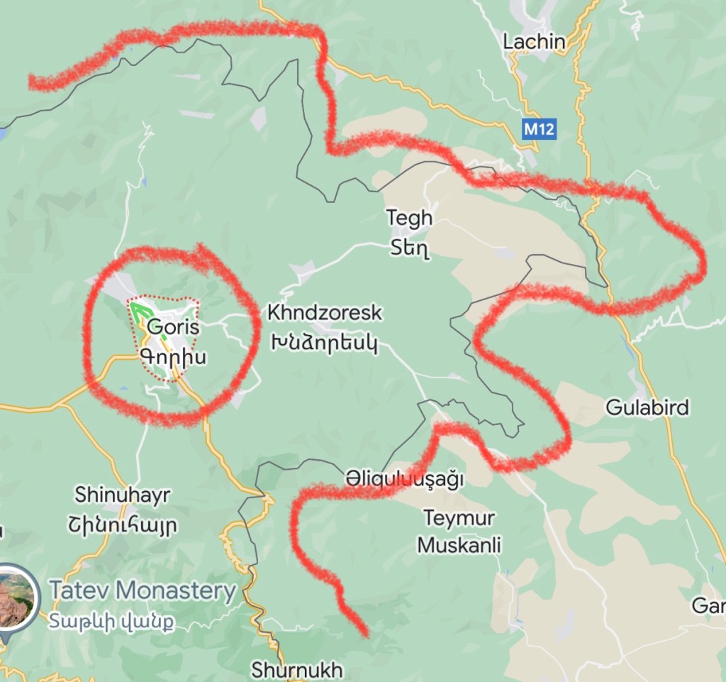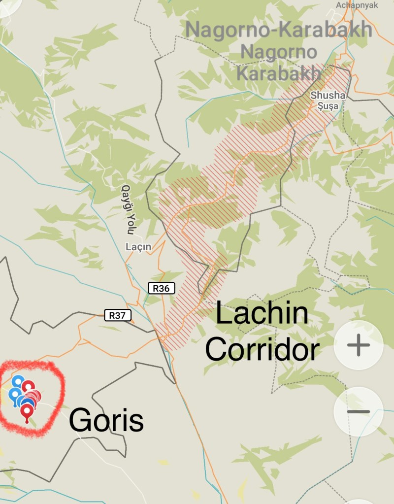 Because Goris is so close to the Azerbeijiani border, we had to take extra care, there are many bases around and we have heard from the locals that they are still shooting people if you get too close to their borderThe Lachin corridor, which was once our only way to get through to Armenian occupied Kharabagh, (shown in red lines on this photo) is now taken over by Azeris and blocked so there is no way of getting in or out, the Armenians in Karabagh are in forced lockdown and the goods that Armenia is trying to send through to them is getting blocked, there are trucks all lined up with humanitarian aid that are not being let it… its a really sad and bad situation and no government around the world is really caring – yet keep sending billions daily over to Ukraine (where THAT money really goes who even knows!) there is so much politics involved and its destroying human lives