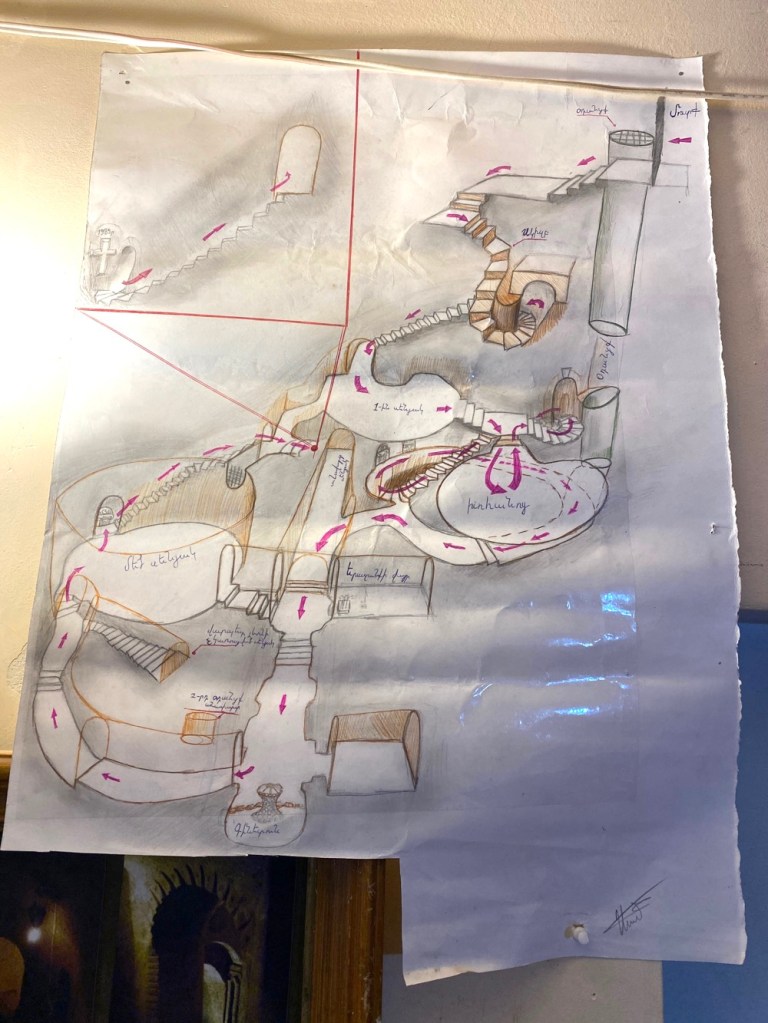 Araxia was saying that her dad did not follow a plan, he said that he got the ideas from a voice in his head guiding him on the design and where to dig, a place like this would most definitely need a plan as the rooms are all running around each other so digging in the wrong area would be dangerous