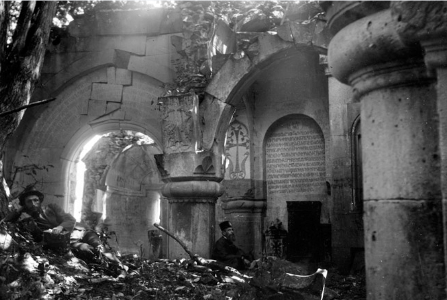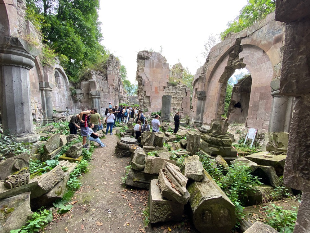The building in the center is the 13th century Holy Astvatsatsin – the main church, of which the entrance, parts of the southern and western walls, sections of flying arches, and pillars are still well preserved.