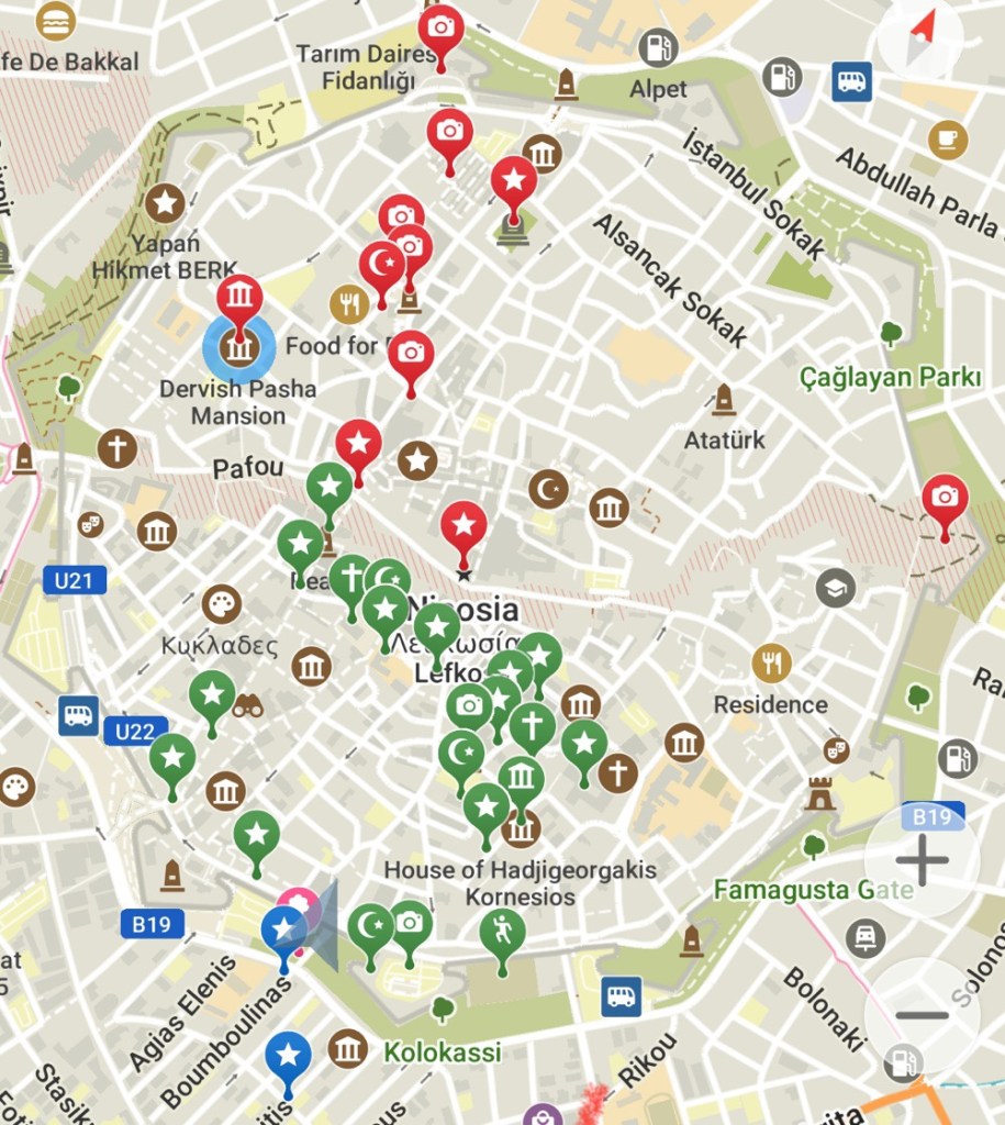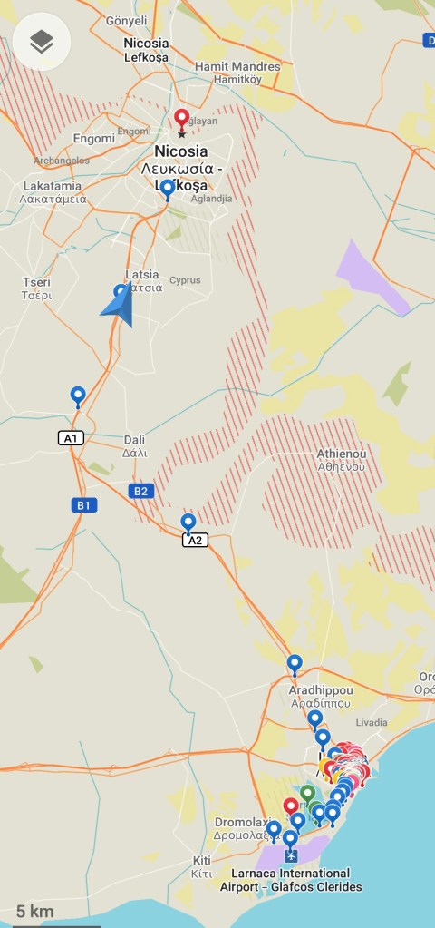 Ok so, all pick ups done, we first drove up to Nicosia, the capital of Cyprus to explore – (the red lines on the map below are the UN buffer zone areas)