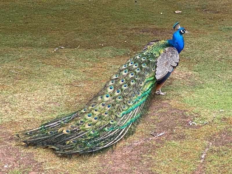 There are a few resident peacocks that roam around the park area and not scared of people – they continuosly make a really loud CAWWW nois to each other and when one starts it kicks the rest of them off!