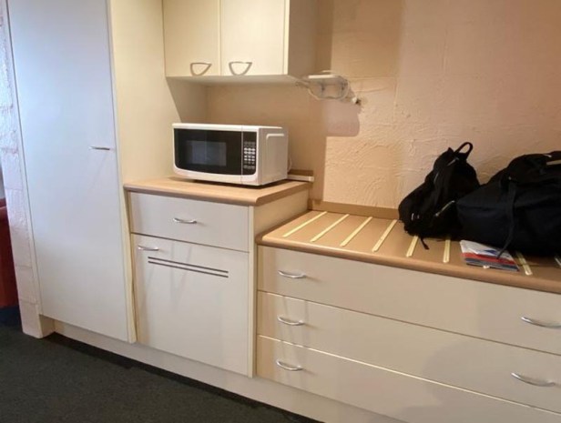 Mini fridge and microwave with cutlery if you want to have your own meals (which I did) so was perfect for me and one of main reasons I chose this accom