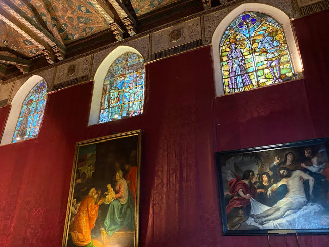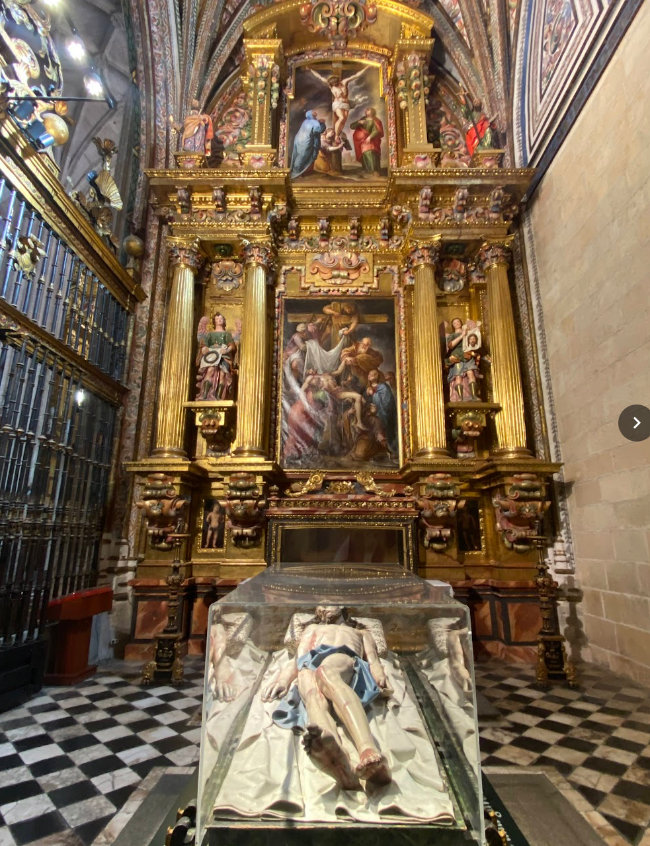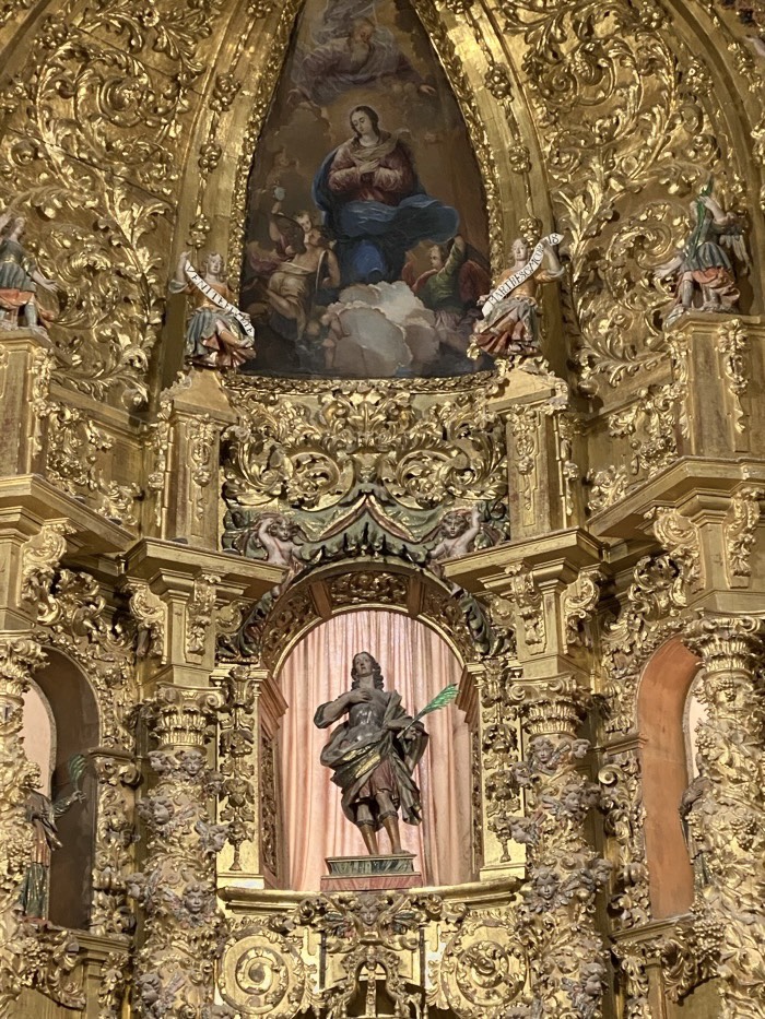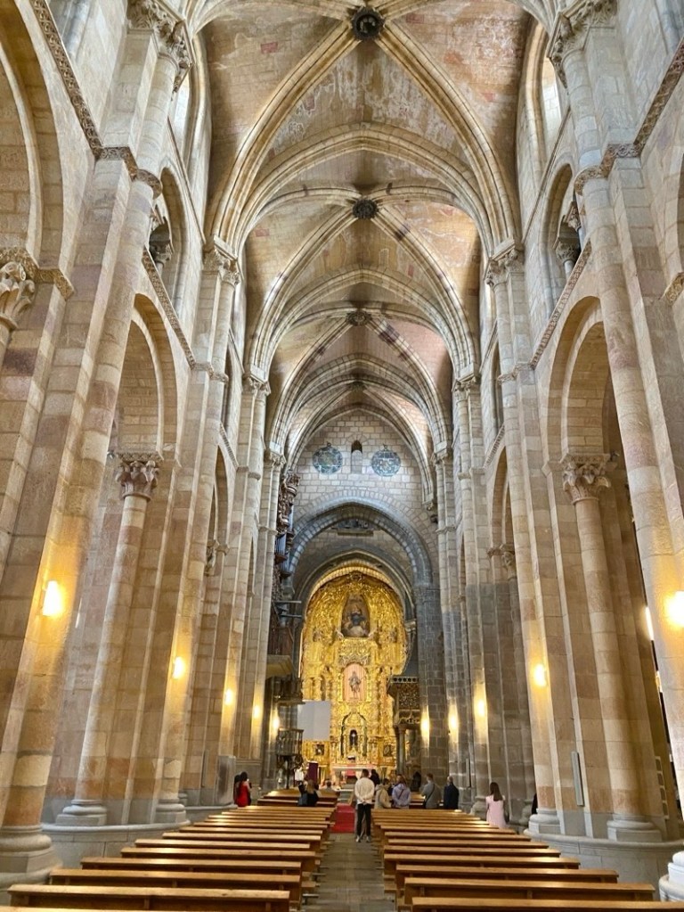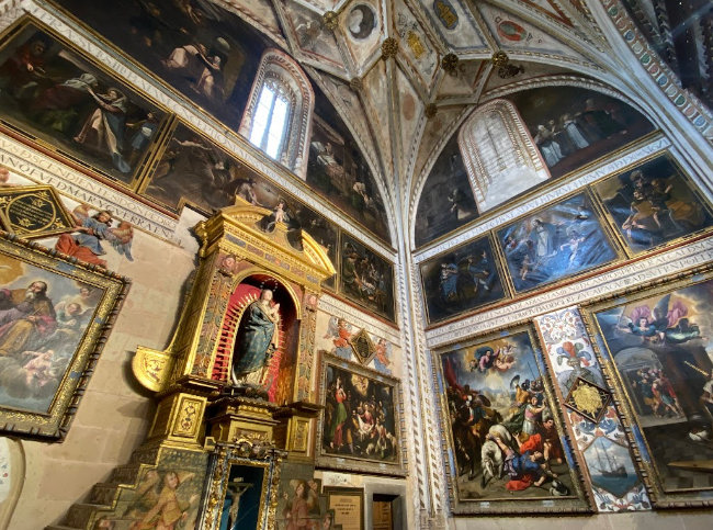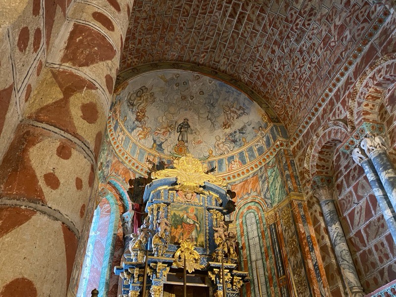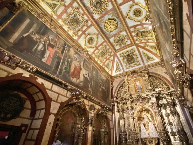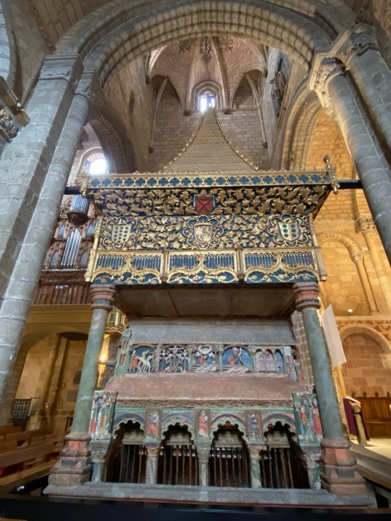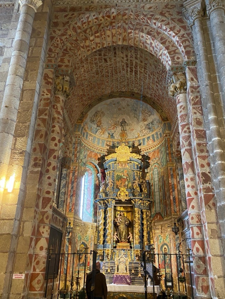 The interior is a latin cross design and a beautiful central nave with 2 side aisles – the gold stands out THE CENOTAPH – this is the 12th c romanesque tomb of the 3 martyrsThere are different little colourful and quaint chapels around the church This artefact is dedicated to St Vincent – Romanesque burial chamber but no body is buried here inside
