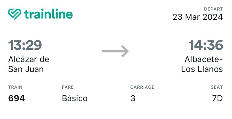 There are around 7 trains per day running between Alcázar de San Juan and Albacete-Los Llanos
