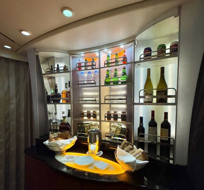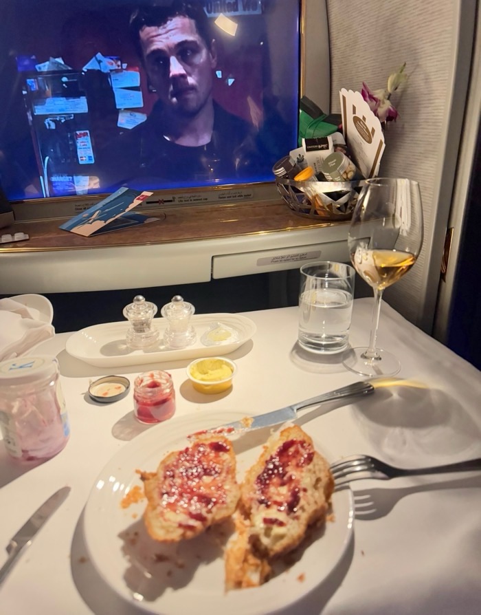 A la carte dining at any time during the flight with much to choose fromStarted with a champagne and snacks of choiceRoasted duck and potato for dinner They served a $700US red wine and brought out 2 carafes, the wine kept flowing!Then Caviar was served! With plenty of sidesWhen youre ready to sleep they make your bed for you using a mattress, so comfortable! 🛏️The self serve bar and snack area