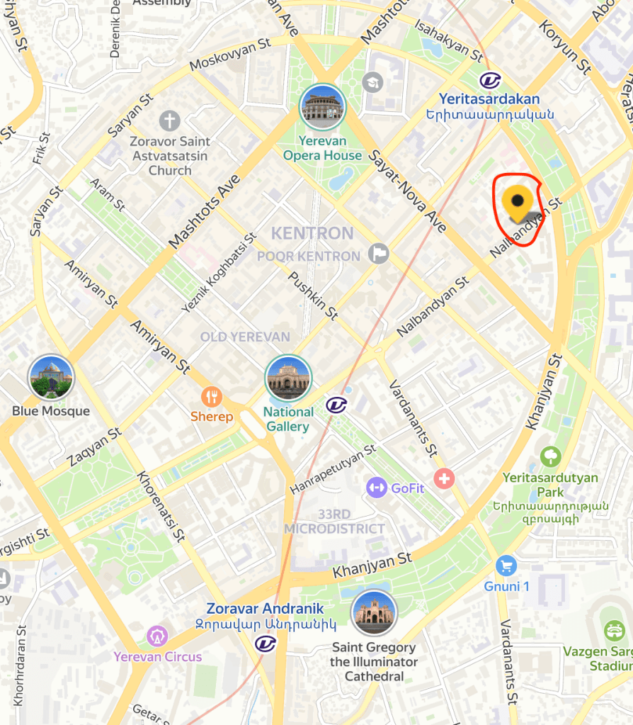 Located on Nalbandyan St close to the corner of Moskovyan St