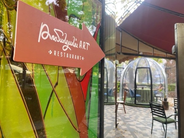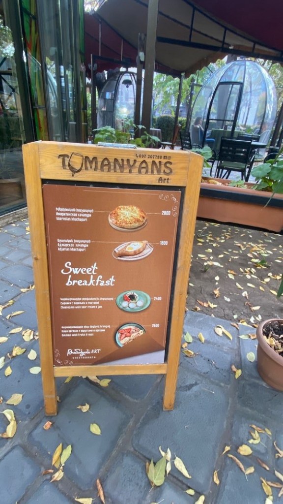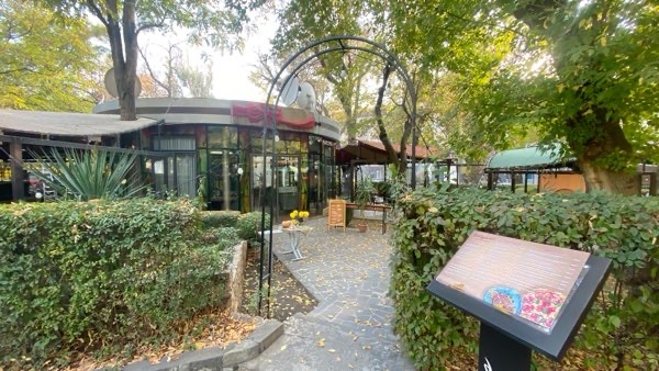 Located in the park near the Yeritasardakan Metro station next to the “hands” monument and on the main road but sitting in the garden you cant hear the cars due to the lovely trees planted all around the restaurant