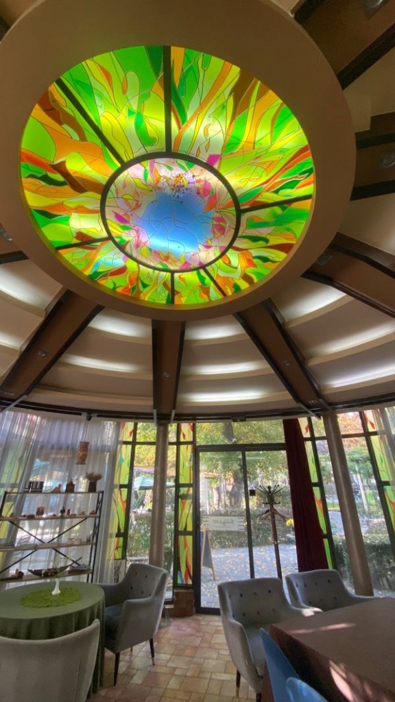 The inside is large and open space and nicely colourful and relaxing with comfy couches and seating with nice coloured glass ceiling